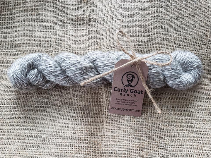 This lovely hank of naturally colored light gray and winter white mohair is from Angora goats raised with love and gently sheared by the same hands that feed them in the beautiful mountains of Prescott, Arizona.