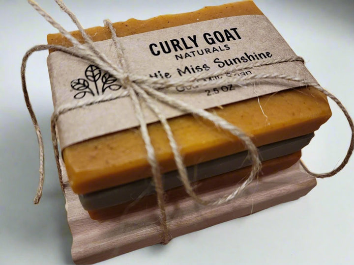Three skinny bar goat milk soaps with a wooden soap dish all wrapped up with a hemp bow!